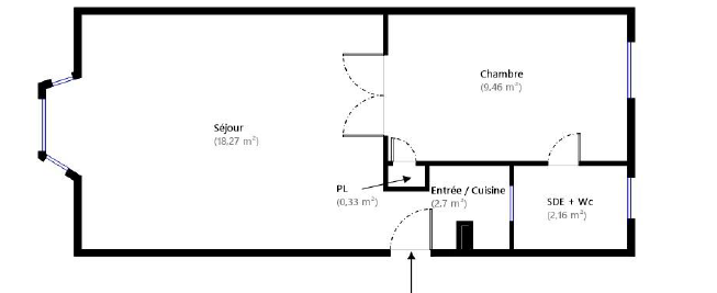 L’appartement se compose d’une entrée s' ouvrant sur un séjour spacieux avec bow-windows apportant charme et clarté, d’une chambre, d’une cuisine ainsi que d’une salle d’eau avec WC